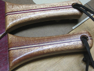 Phillipine mahogany handles with purpleheart and maple pinlines with leather wrist thongs.